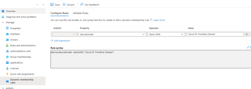 While the machines are provisioning, we can use the time to create a dynamic group or a filter that can be used for assignements. For the blog, I’ve created a dynamic device group in Entra as shown in the screenshot: