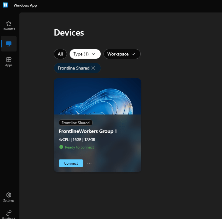 Now, it’s time to take a look from a user perspective. Start your Windows app and you’ll see a new machine with the type “Frontline Shared”.