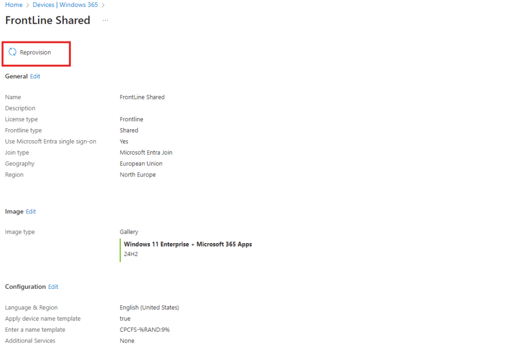 Note: At the moment of writing this post, it requires you to change the OS Image within the policy to ensure the system does a full reporvision. If you just change the name, it will not fully reprovision the Cloud PC’s related to this policy.