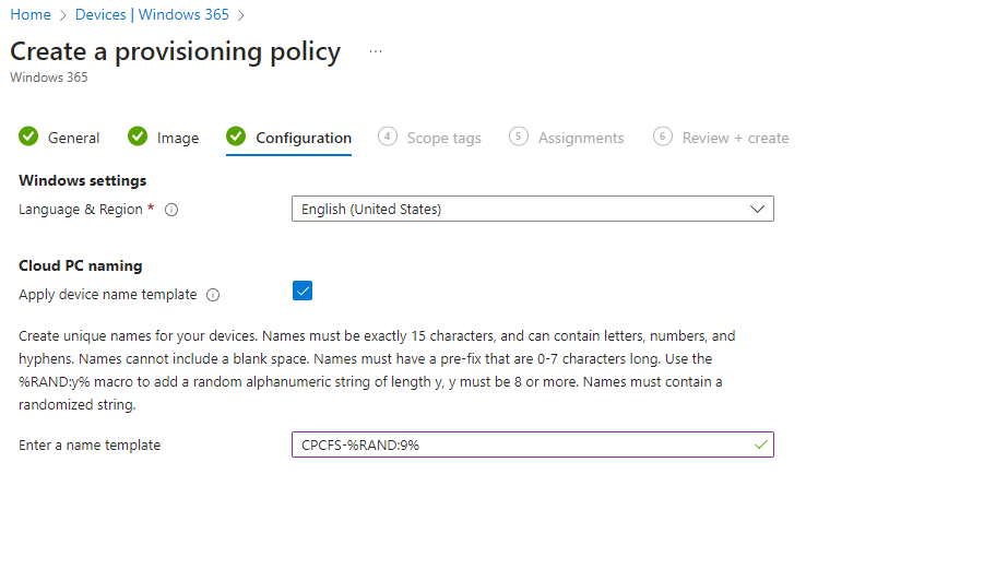 In the next step, we’ll select Language & Region and configure a device name template(if required):